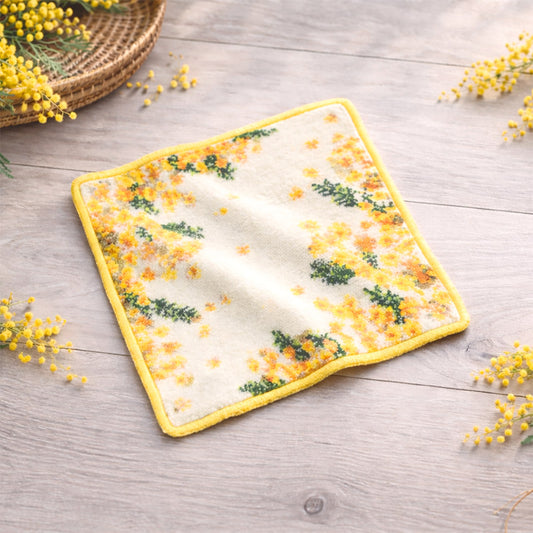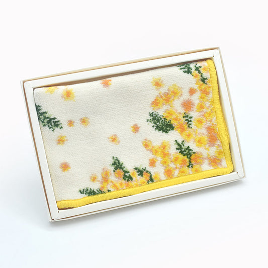 日本製 ミモザ柄 箱入りラッピング済 シェニール織 タオルハンカチ Enjeau アーンジョー 花柄 ギフト プレゼント 贈答