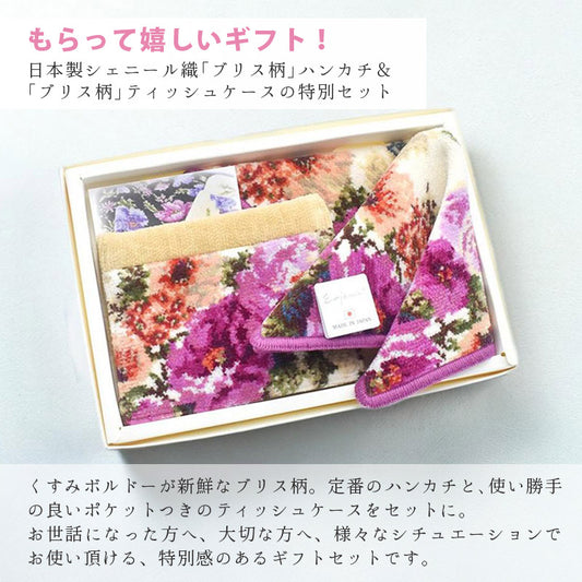 日本製 ブリス柄 シェニール織ハンカチ&ポケットティッシュケース ギフトセット ラッピング済み アーンジョー Enjeau