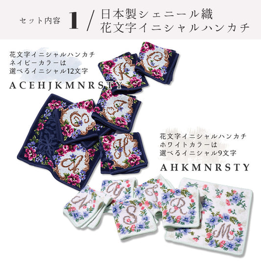 ギフトボックス入り 選べる 花文字イニシャルハンカチ 23cm ホワイト