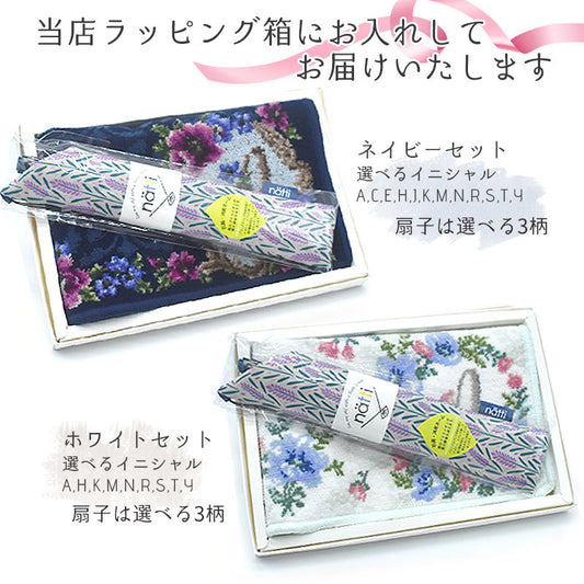 日本製 選べる イニシャル シェニール織 ハンカチ&扇子 ギフトセット 2166