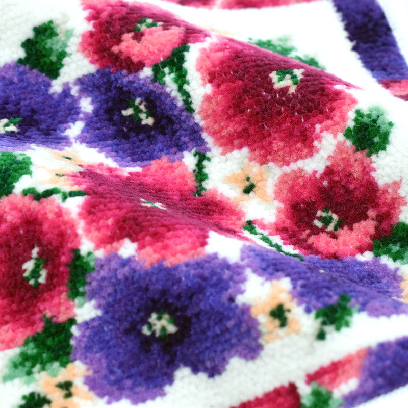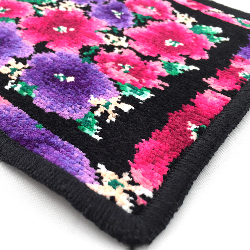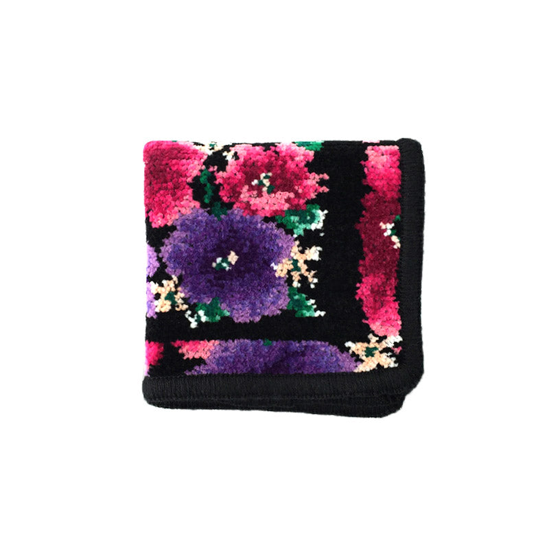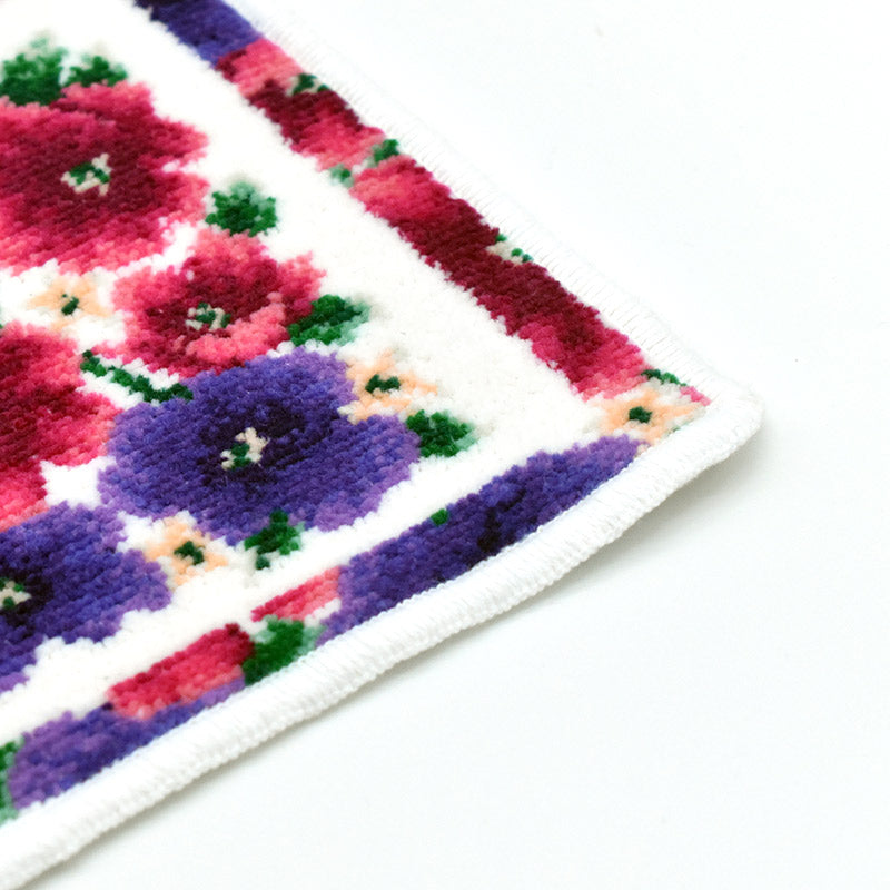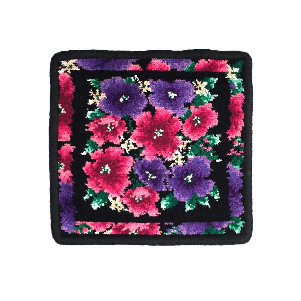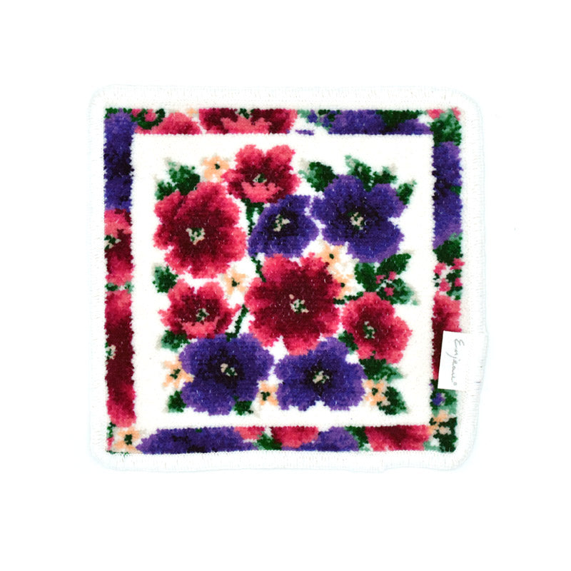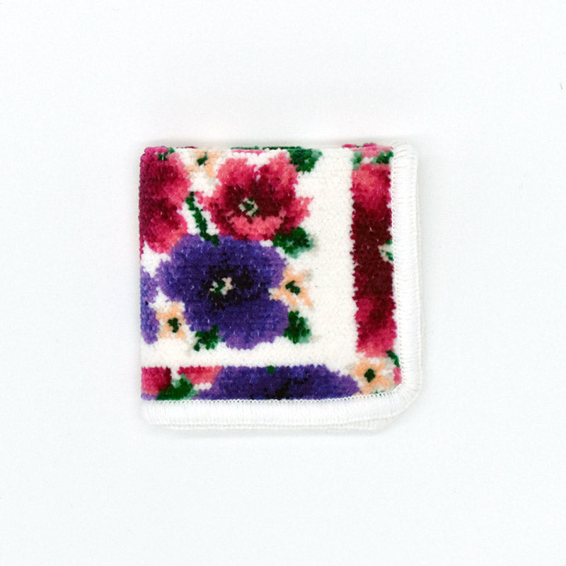 深みのあるピンクとパープルの花にノスタルジックなグリーンの葉で落ち着いたレトロ感のあるシリーズのミニサイズハンカチ(17cm)。