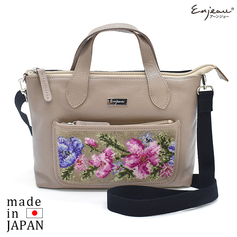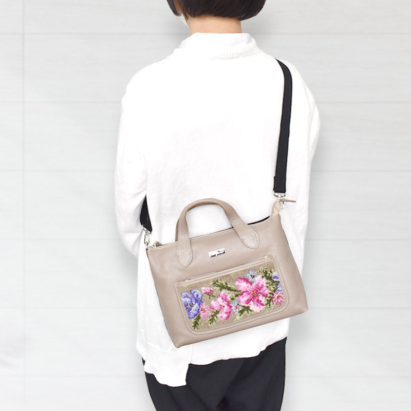 シェニール織×牛革で仕上げたおでかけに便利なレザーショルダーバッグ。背面には上品なブラックのスウェード生地を採用。