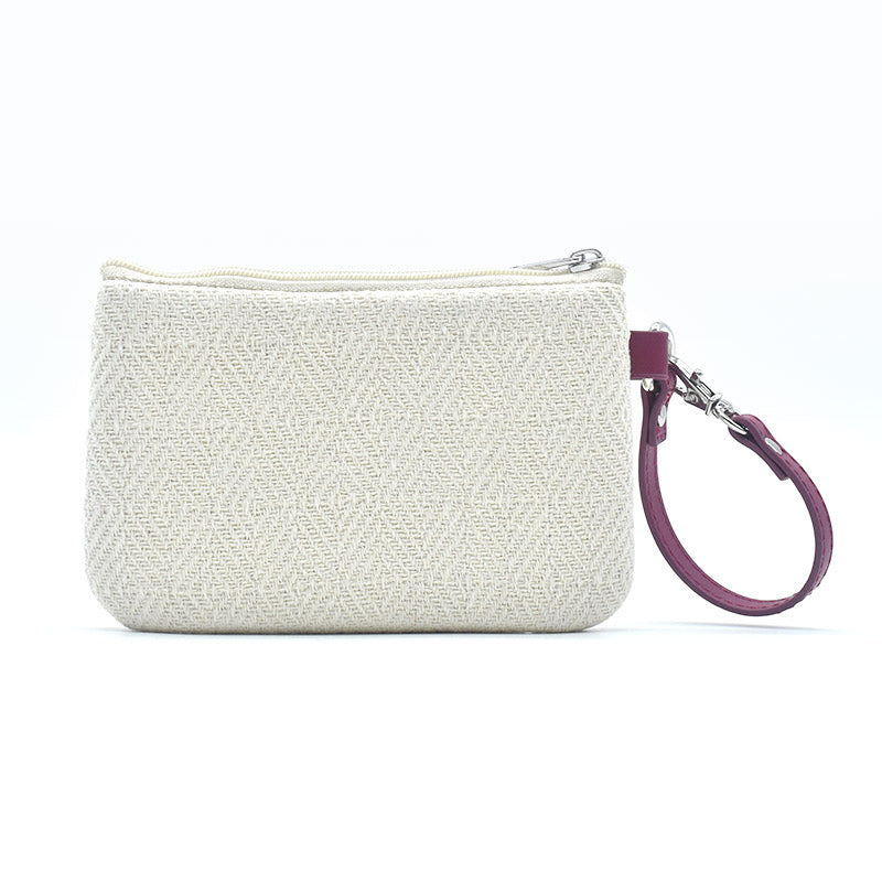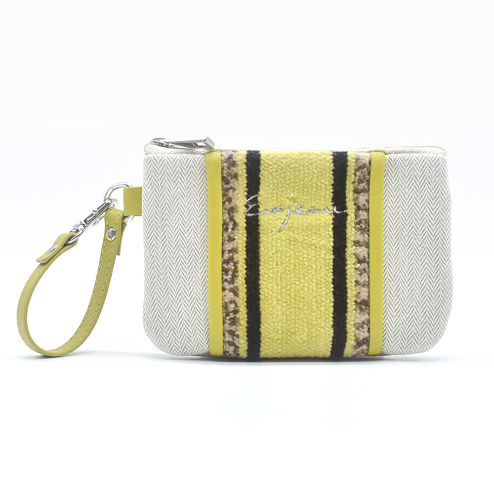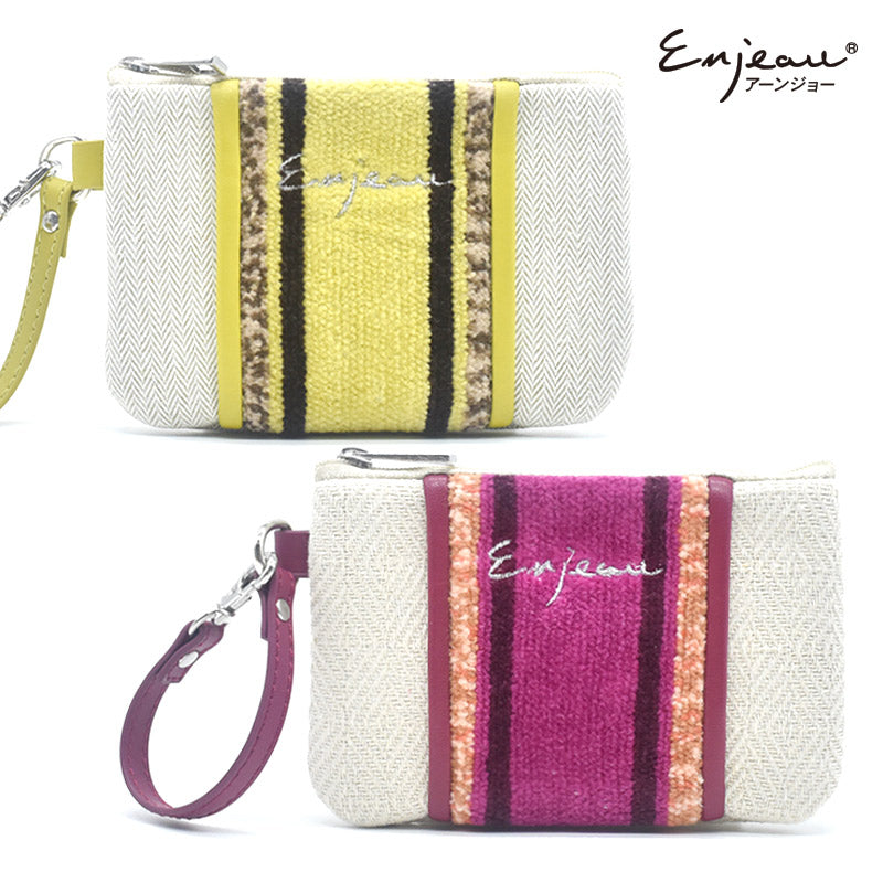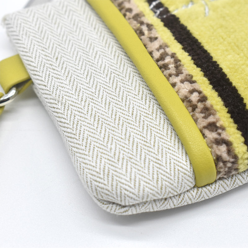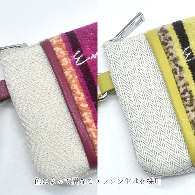 軽量で、強く、高級感のあるメランジ生地を使い、センター部分にはアーンジョーのシェニール織。持ち手や底部分、周りの傷みやすいところは上質な合皮でデザインされたストラップポーチです。