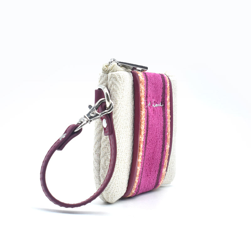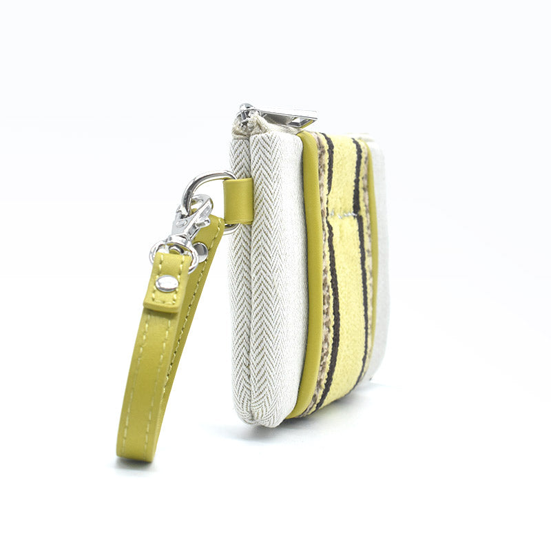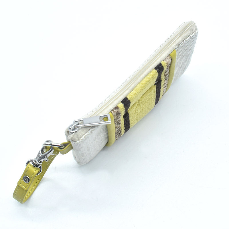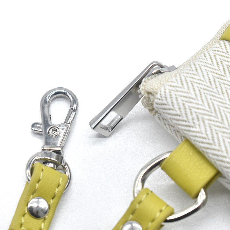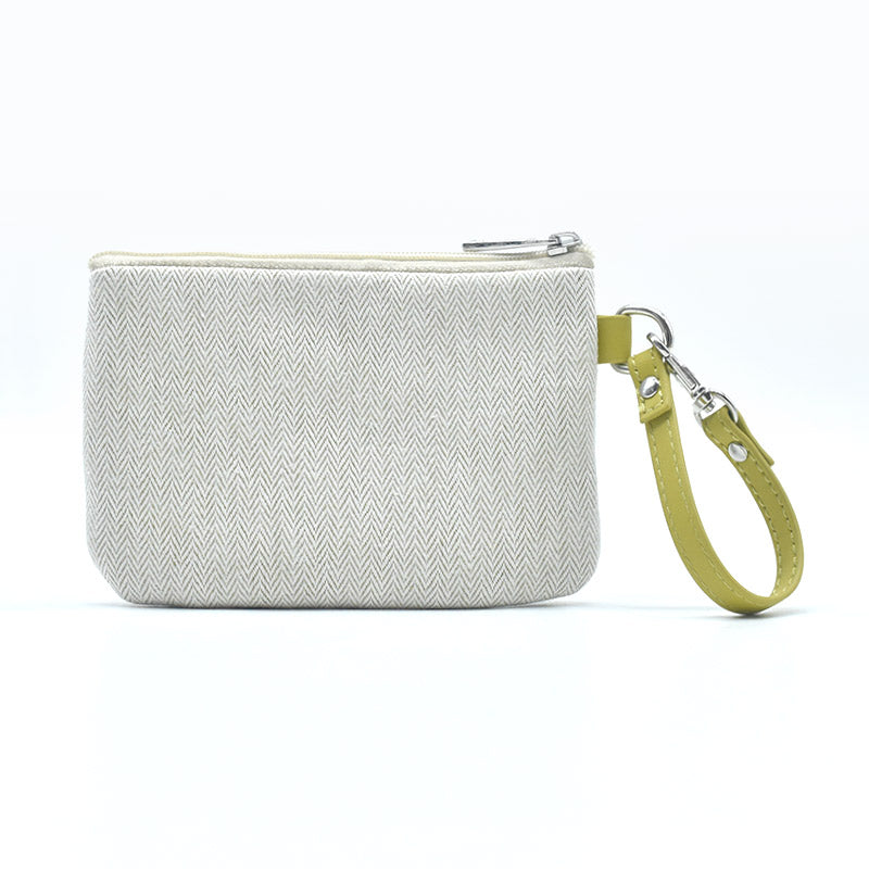 軽量で、強く、高級感のあるメランジ生地を使い、センター部分にはアーンジョーのシェニール織。持ち手や底部分、周りの傷みやすいところは上質な合皮でデザインされたストラップポーチです。