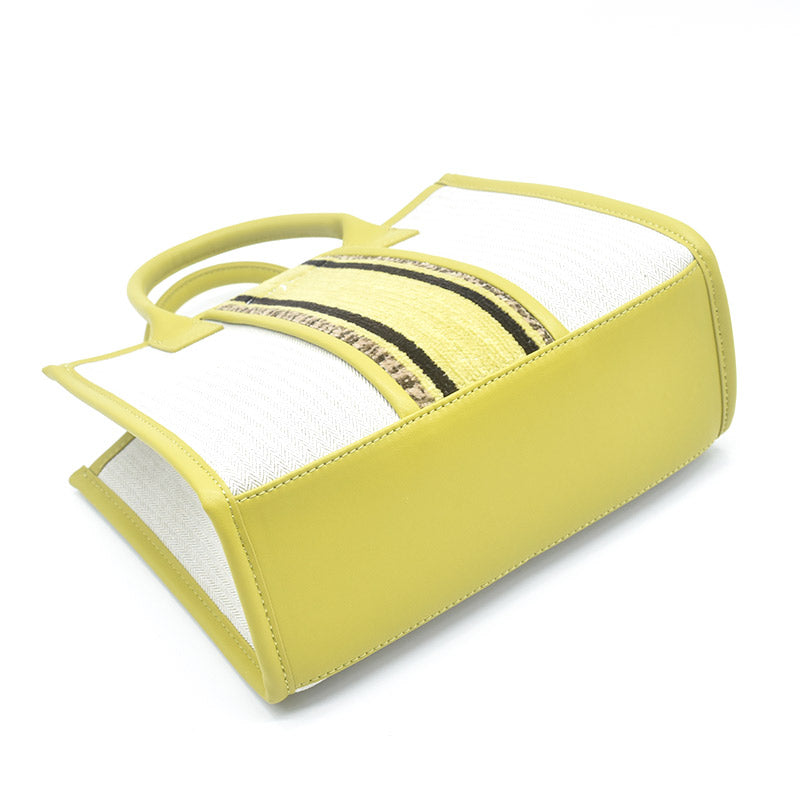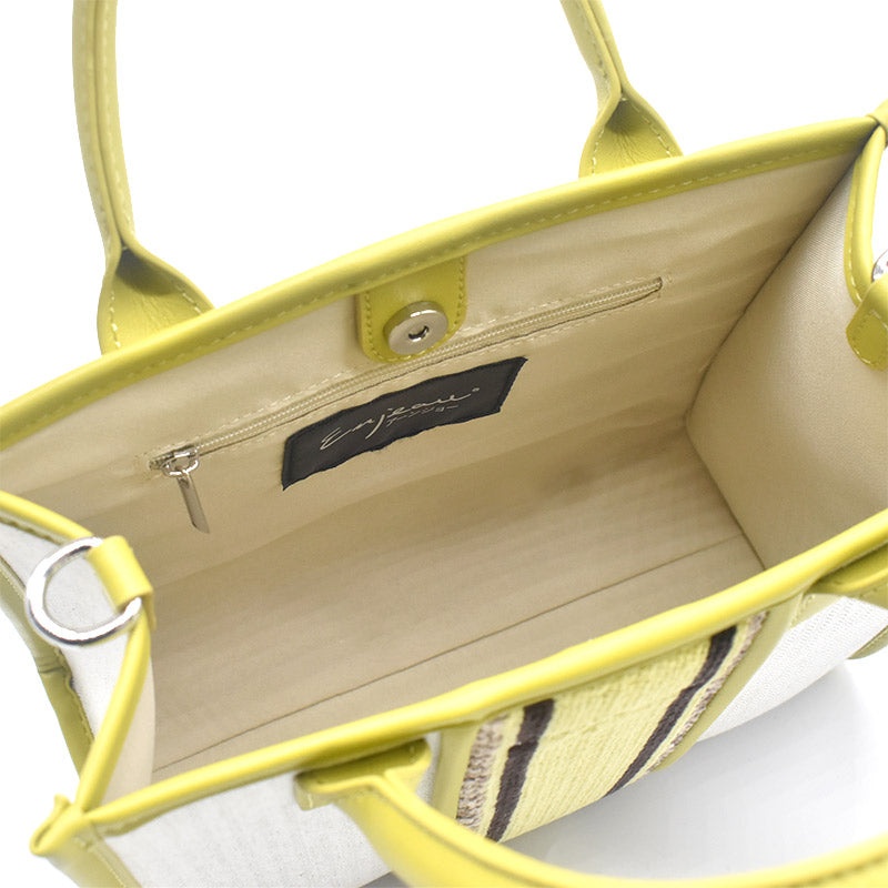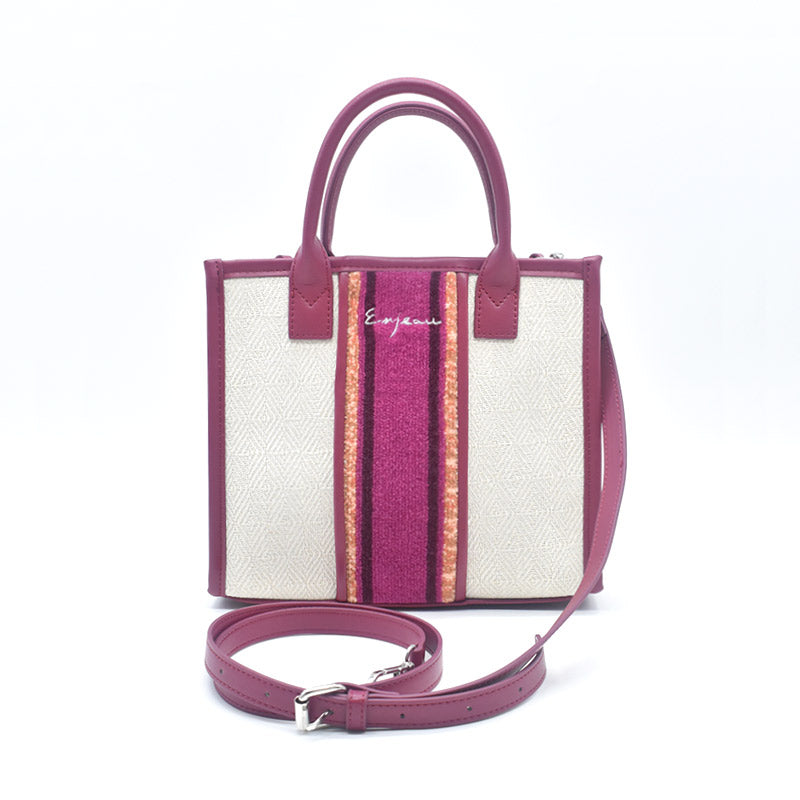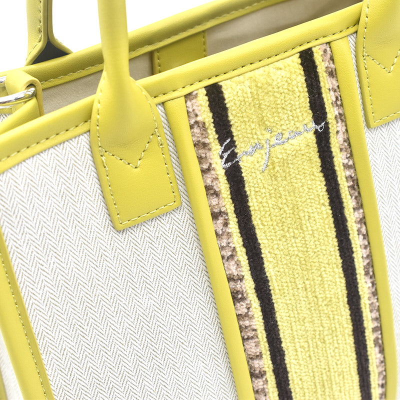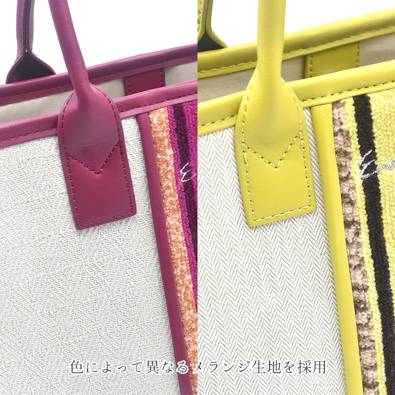 軽量で、強く、高級感のあるメランジ生地を使い、センター部分にはアーンジョーのシェニール織。持ち手や底部分、周りの傷みやすいところは上質な合皮でデザインされたトートバッグです。