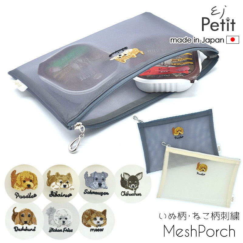 プードル シュナウザー 柴犬 柄に、新たにチワワ、ダックスフンド、猫柄の刺繍が入った メッシュポーチ。