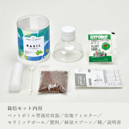 セパレート型のペットボトルで、土を使わないで野菜やハーブを育てる水耕栽培セットです。土を使わない水耕栽培のため、お部屋の中で簡単・清潔に野菜やハーブの栽培を楽しめます。