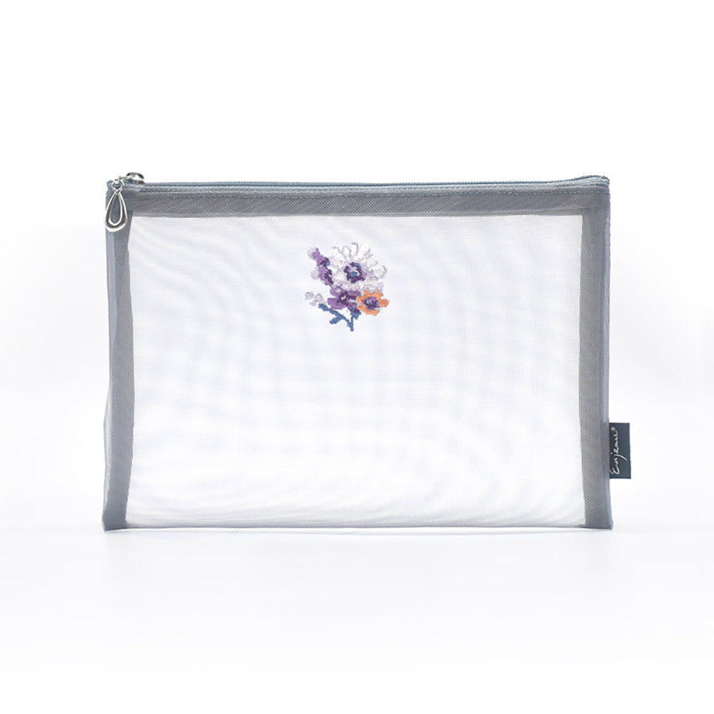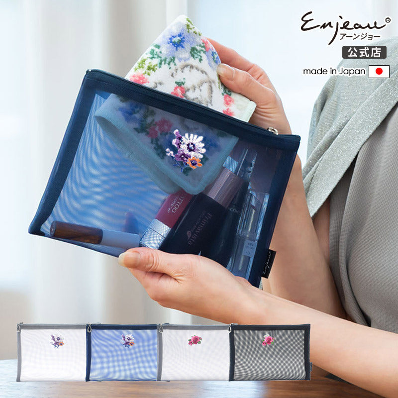 丁寧にワンポイント上品なシルバーのイニシャル刺繍を施した、大人の女性のためのメッシュポーチ。