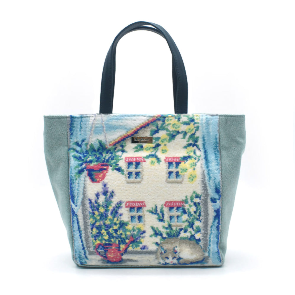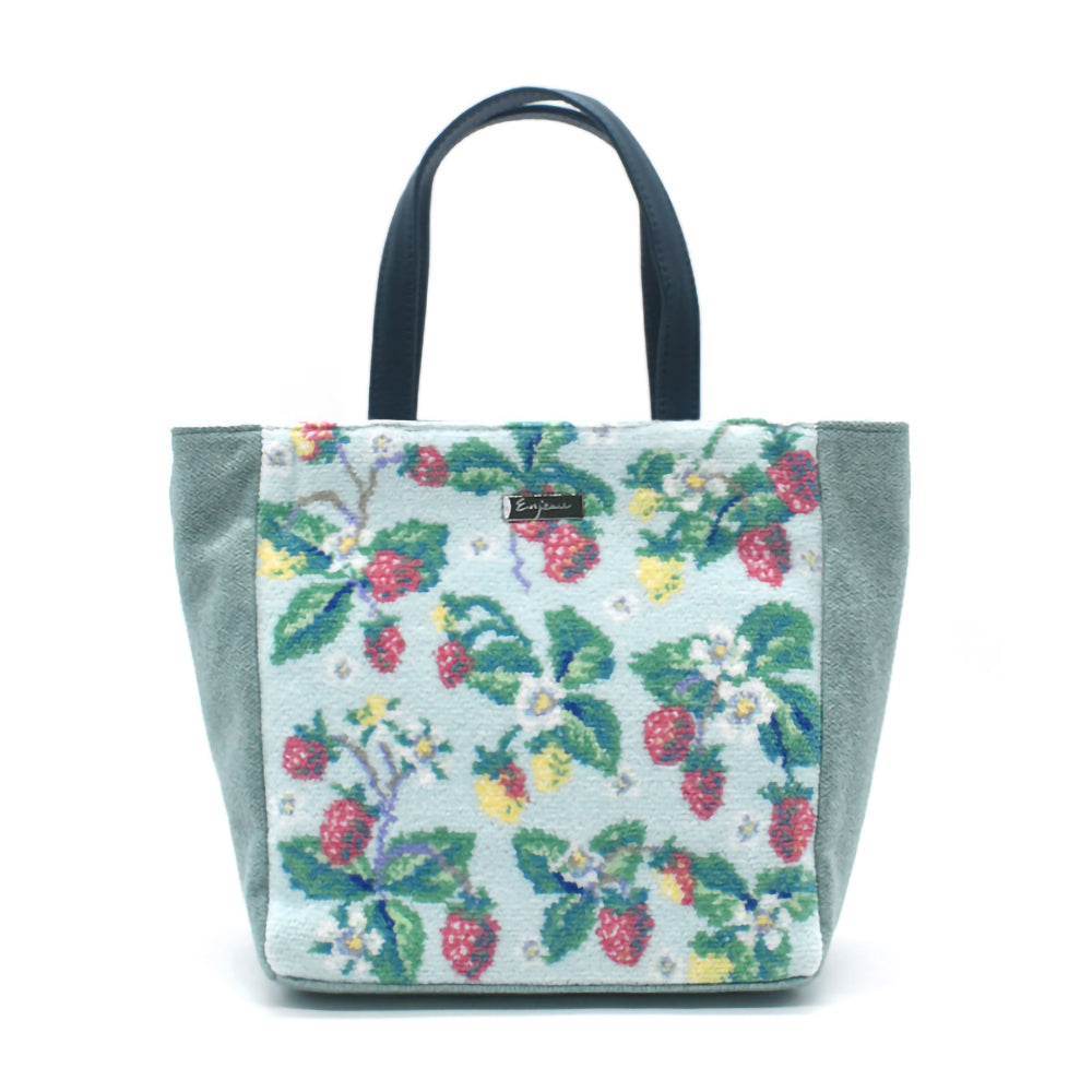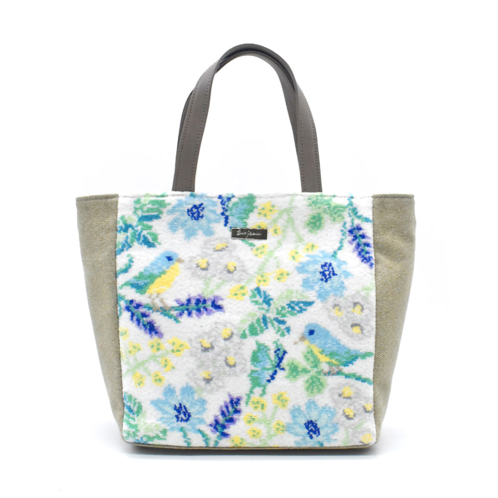 前面のシェニール織と、ボリューム感のある柔らかな風合いの「モルト」生地を採用したトートバッグ。